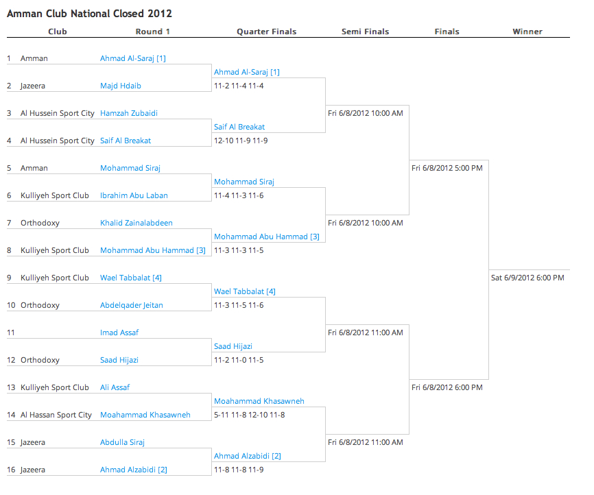 First Round games started today at 6pm with all seeded players (Ahmad Alsaraj (1), Ahmad Alzbaidi (2), Mohammad Abu Hammad (3) and Wael Tabbalat (4) making their way clearly through to tomorrows quarter finals, where all players will start at 10am to be ready for their second match of the day, the semi finals or the plate rounds.