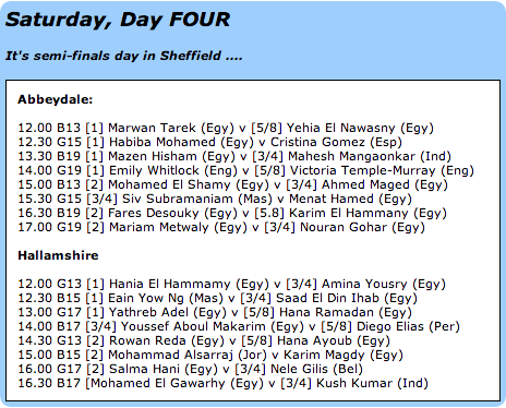 Wow what a day at Hallamshire. The boys under 15 quarter-final match of Mohammad Alsarraj (JOR) against Indias Velevan Senthilkumar dropped to its knees and was the longest, recording 60 minutes and a (3:1) win of Alsarraj 12/10, 10/12, 11/6, 11/8.